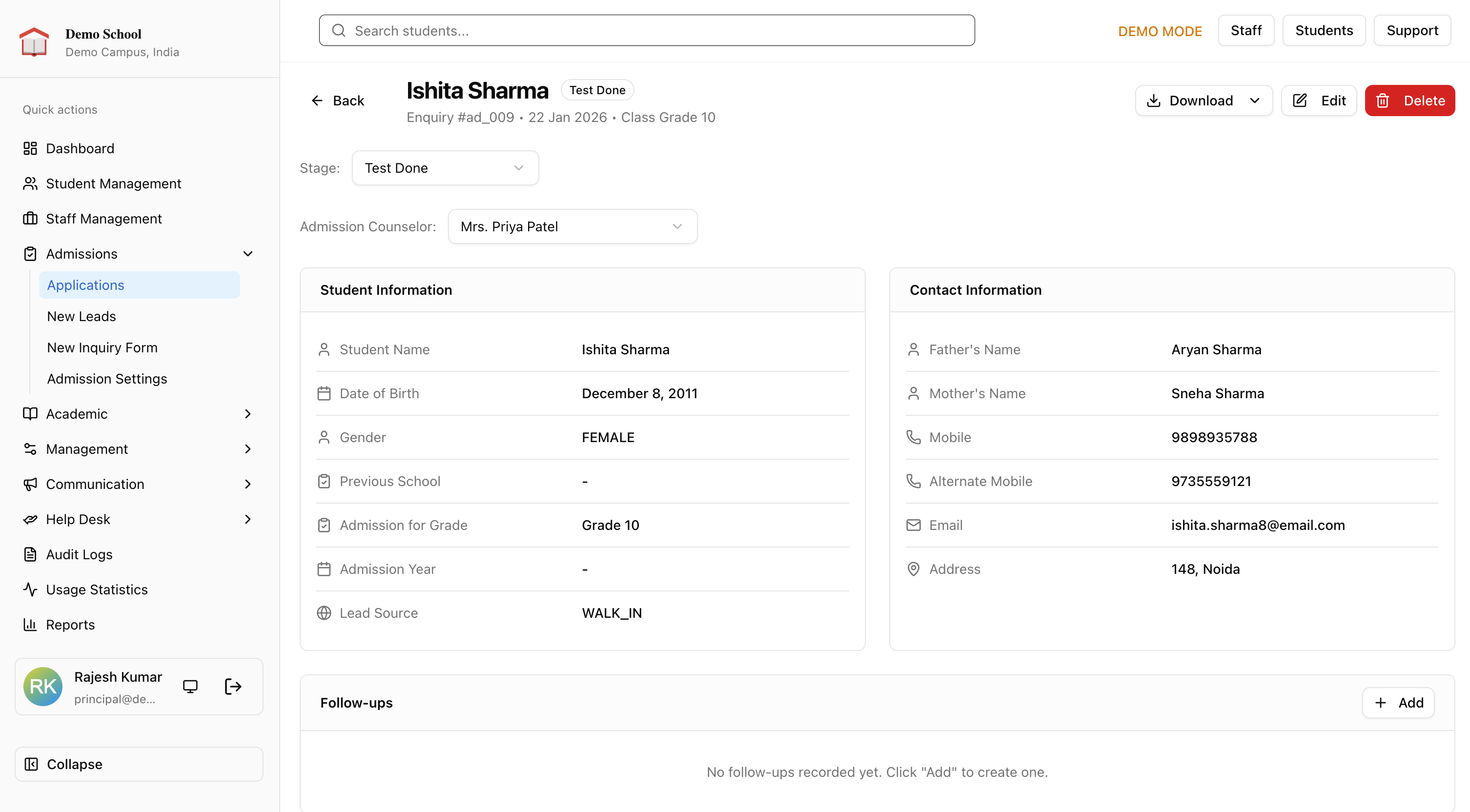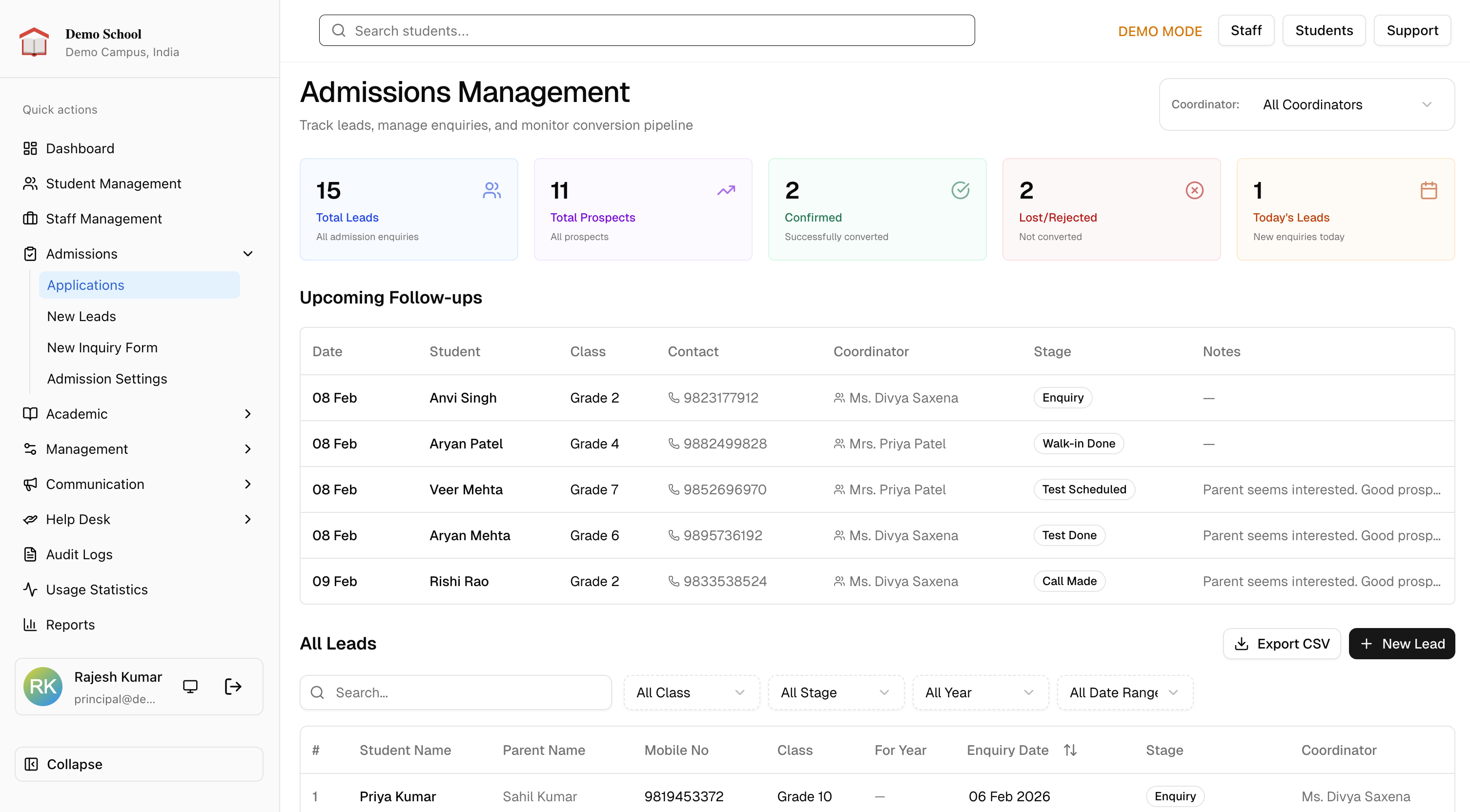 See your full admissions funnel in one view. New enquiries, active prospects, upcoming tests, confirmed admissions, and lost leads, each with a stage, an owner, and a follow-up date.