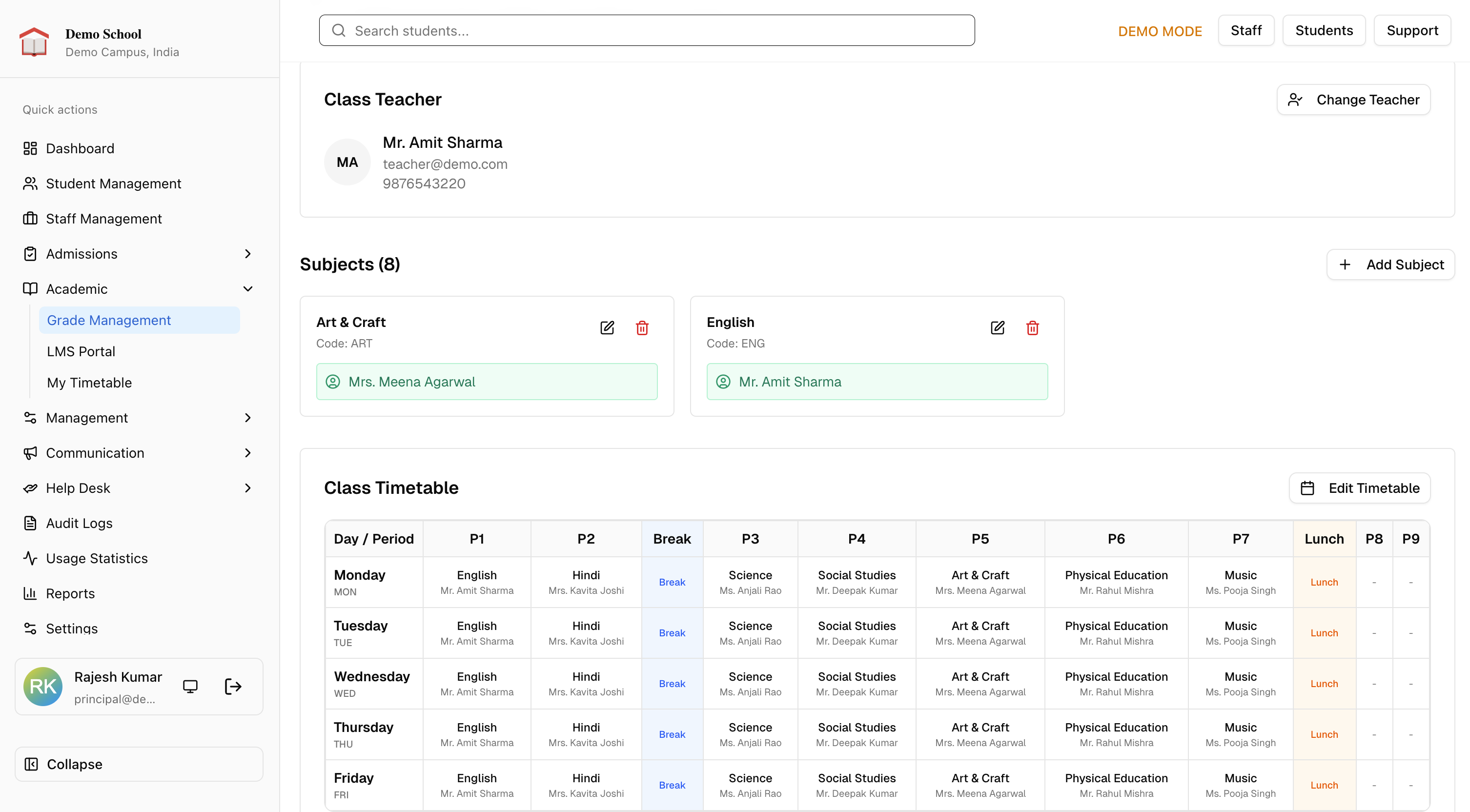 Teachers see their complete weekly timetable in one place. Classes, subjects, rooms, and sections are clearly laid out so teachers always know where they need to be.