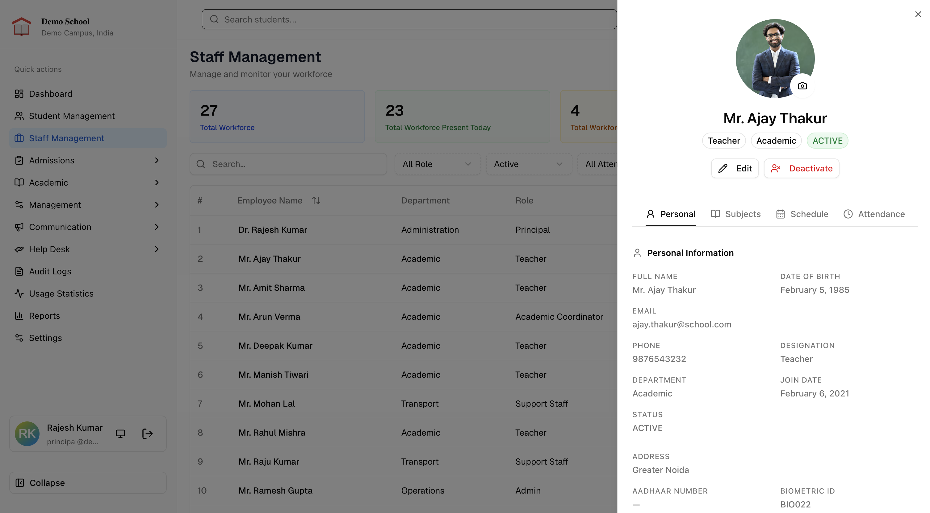 Personal details, subjects they teach, attendance with biometric integration, and see present staff today in one glance.